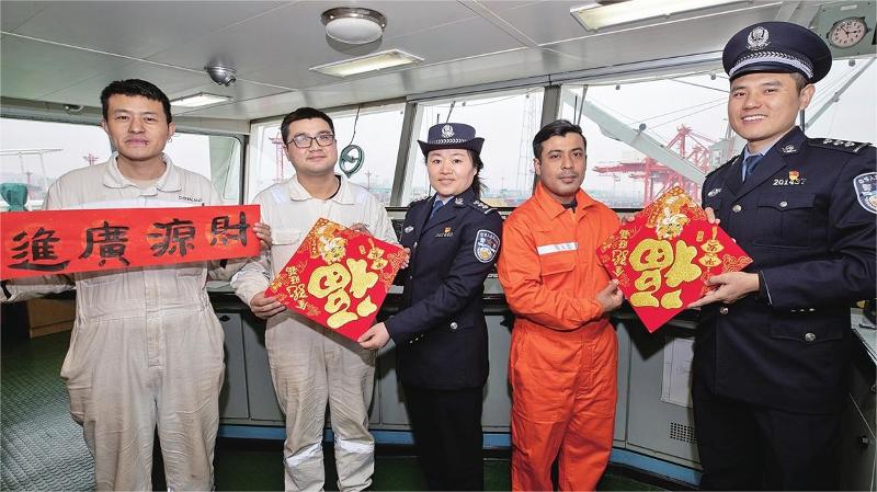 昨天(2月5日),張家港出入境邊防檢查站開展“送‘福’進(jìn)外輪共度中國(guó)年”活動(dòng),民警將“?!弊帧⒋郝?lián)和窗花送到外籍船員手中,共迎中國(guó)龍年的到來(lái)。